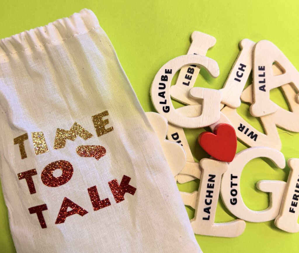 Time to talk – ein Spiel zum Ins-Gespräch-Kommen. Ja, es ist Zeit – wir müssen reden! Aber worüber eigentlich? Über alles: über dich, über mich, über Gott und die Welt . Jeder Buchstabe steht für ein Thema, das Gespräche anstoßen kann . Eine Person zieht einen Buchstaben und erzählt, was ihr oder ihm zu diesem Wort einfällt: eine Erinnerung , ein Gedanke oder ein Gefühl .Danach kommt der Buchstabe zurück in den Beutel , und die nächste Person ist dran .. Komm ins EKJB nach Niebüll und hol dir dein „Time to talk“ ab.